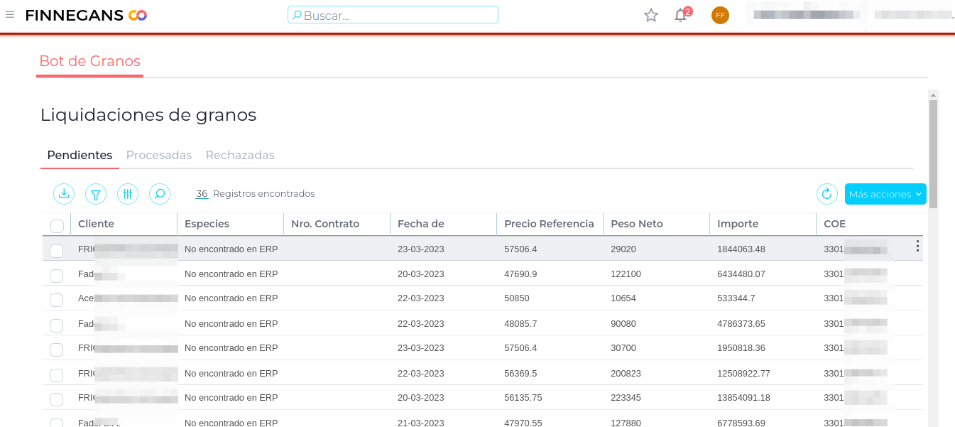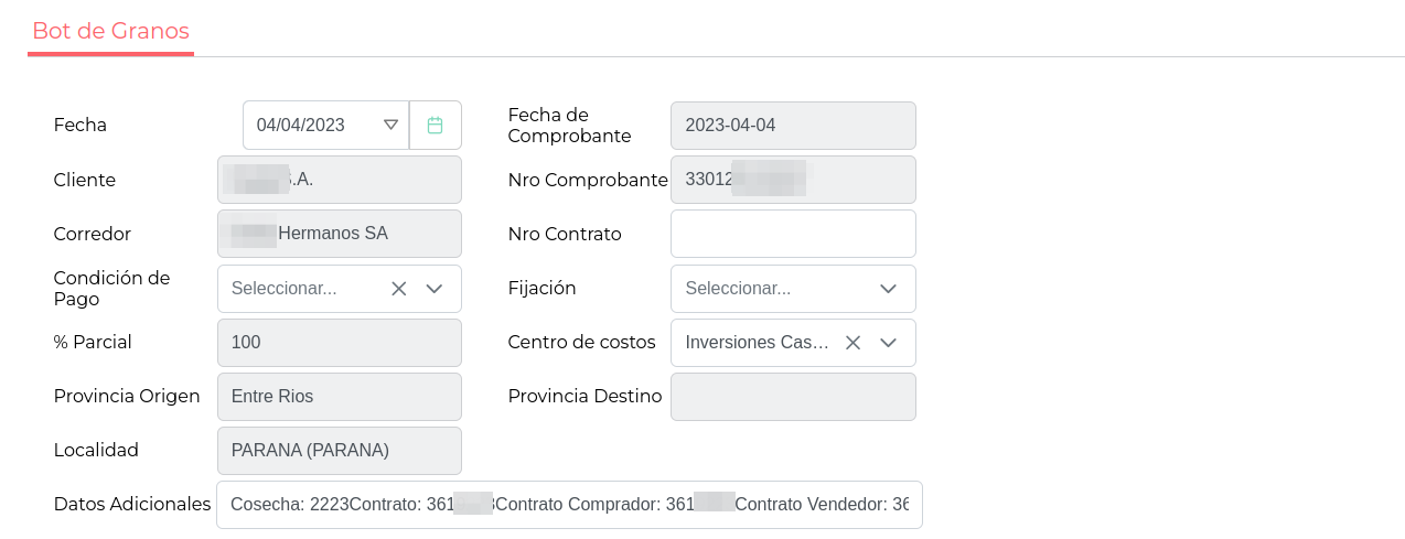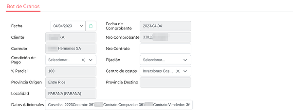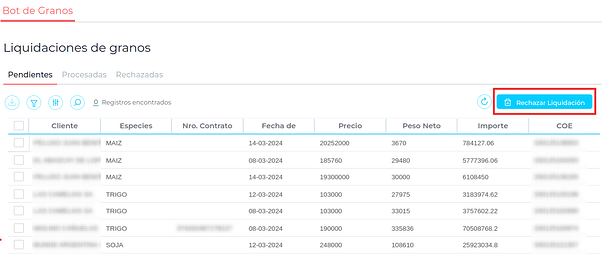 c. Para enviar liquidaciones del Bot de Granos al ERP el usuario tiene que ingresar una a una para completar los datos que hacen falta y que son solicitados por el ERP. Se hace click sobre cada uno de los ítems: