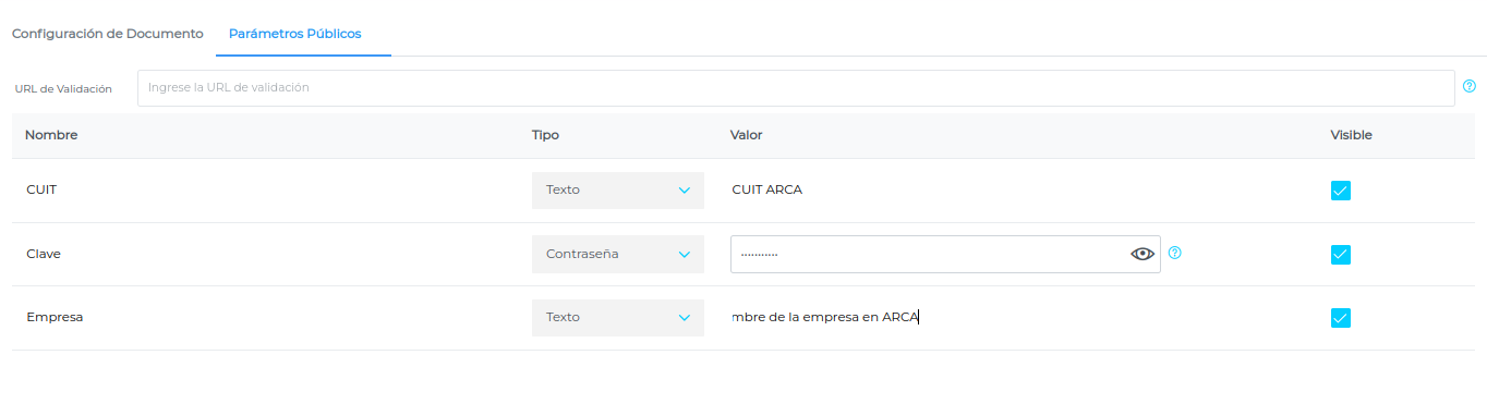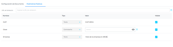 d. En la solapa “Parámetros Públicos” digitar el usuario y contraseña que se utilizan para ingresar a la plataforma de ARCA, también se digita el nombre de la empresa tal cual como figura registrada oficialmente y finalmente hacer clic en el botón “Confirmar”.