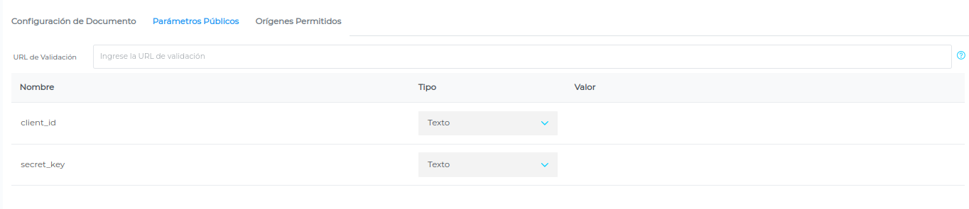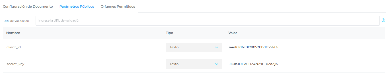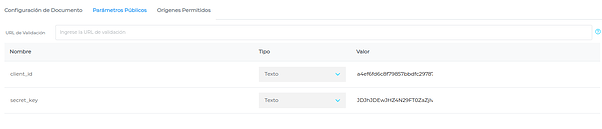 e. En la solapa “Parámetros Públicos” digitar las keys (client_id y secret_key) definidas para el usuario que está configurando el método.
