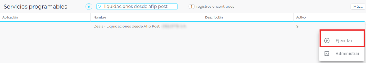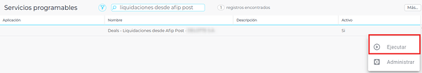 - Buscar el servicio “Deals - Liquidaciones desde Afip Post - NOMBREDELAEMPRESA”, presionar sobre los 3 puntitos de la derecha y presionar en Ejecutar.