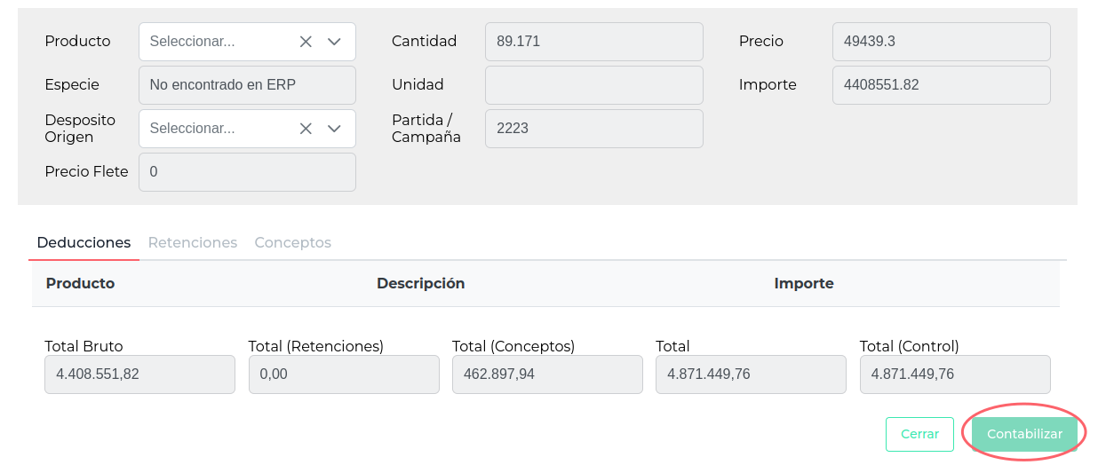 d. Después de completar todos los datos se hace click en el botón “Contabilizar” para enviar la liquidación al ERP:
