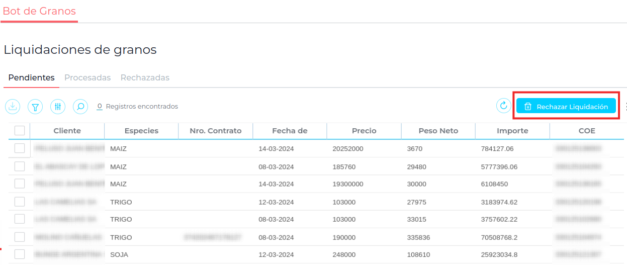 b. Desde la grilla se podrán observar las liquidaciones que se obtuvieron, además podrán ser administrados por el usuario: rechazarlas o enviarlas al ERP: