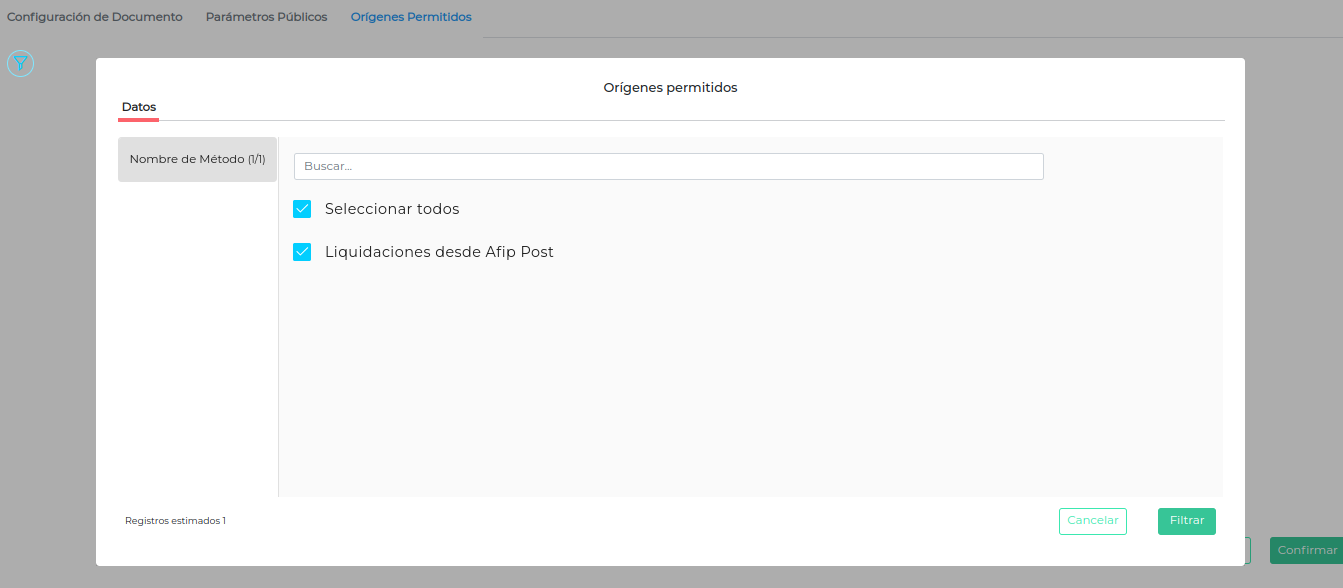 f. En la solapa “Orígenes Permitidos”, se debe agregar el procesamiento que se definió anteriormente: seleccionar “Liquidaciones desde Afip Post”. El paso siguiente es presionar en el botón “Filtrar”.