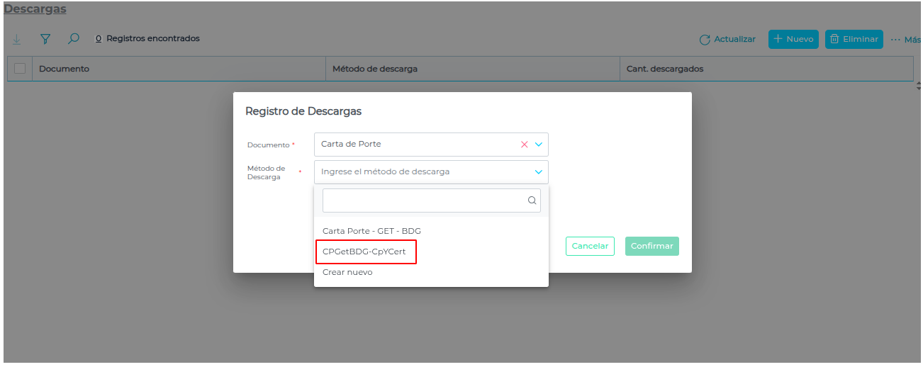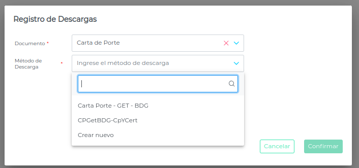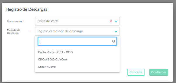 - Definir el documento “Carta de Porte”, método de descarga “Carta Porte - Get - BDG” y presionar en el botón “Confirmar”.