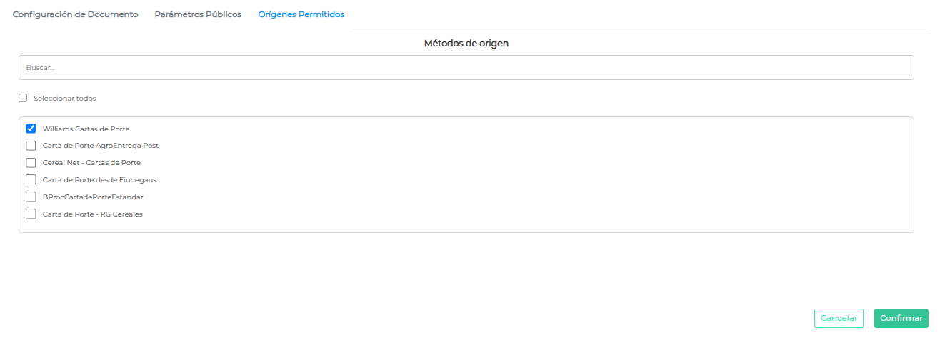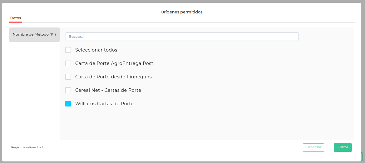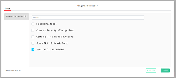 - En la solapa “Orígenes Permitidos”, se debe agregar el procesamiento que se definió anteriormente: seleccionar “Williams Cartas de Porte”. El paso siguiente es presionar en el botón “Filtrar”.
