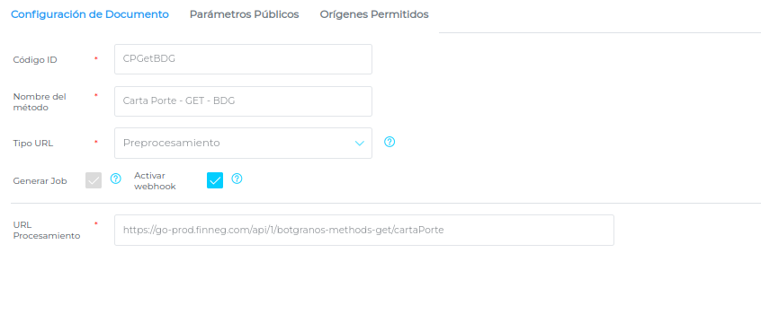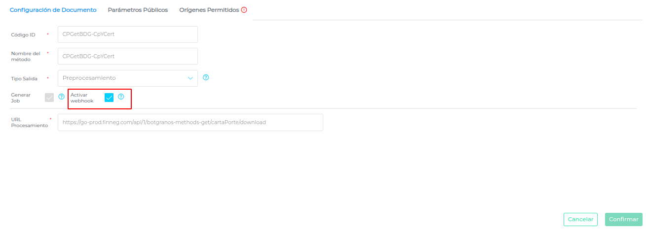 - En la solapa “Configuración de Documento” activar el check para la opción “Activar webhook”, el cual habilitará la solapa “Orígenes Permitidos”