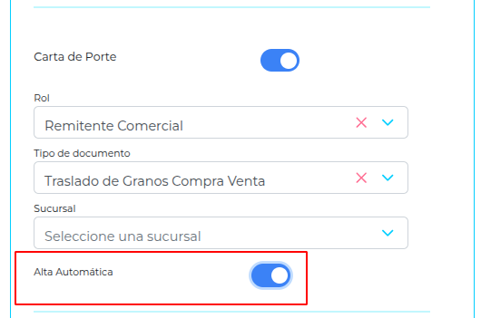 - Se puede activar la opción “Alta Automática” al configurar Carta de Porte: