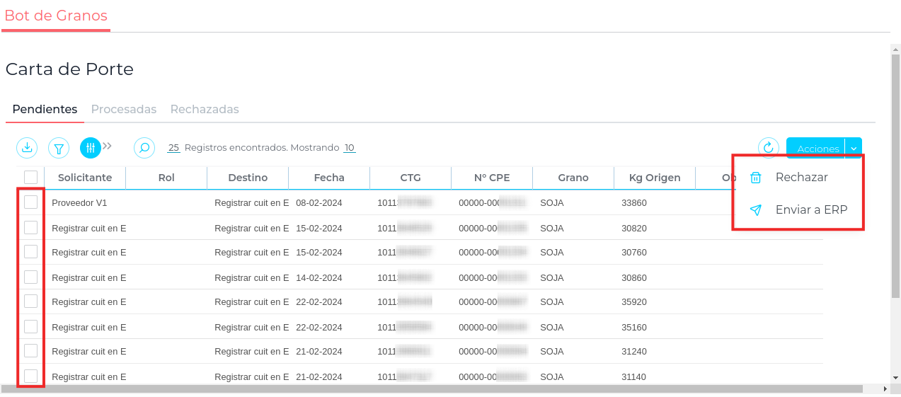- Luego de estas configuraciones, Williams envía al sistema las Cartas de Porte desde su plataforma, dejándolas disponibles en la app Bot de Granos. De esta forma pueden ser administrados por el usuario, rechazarlos o enviarlos al ERP: