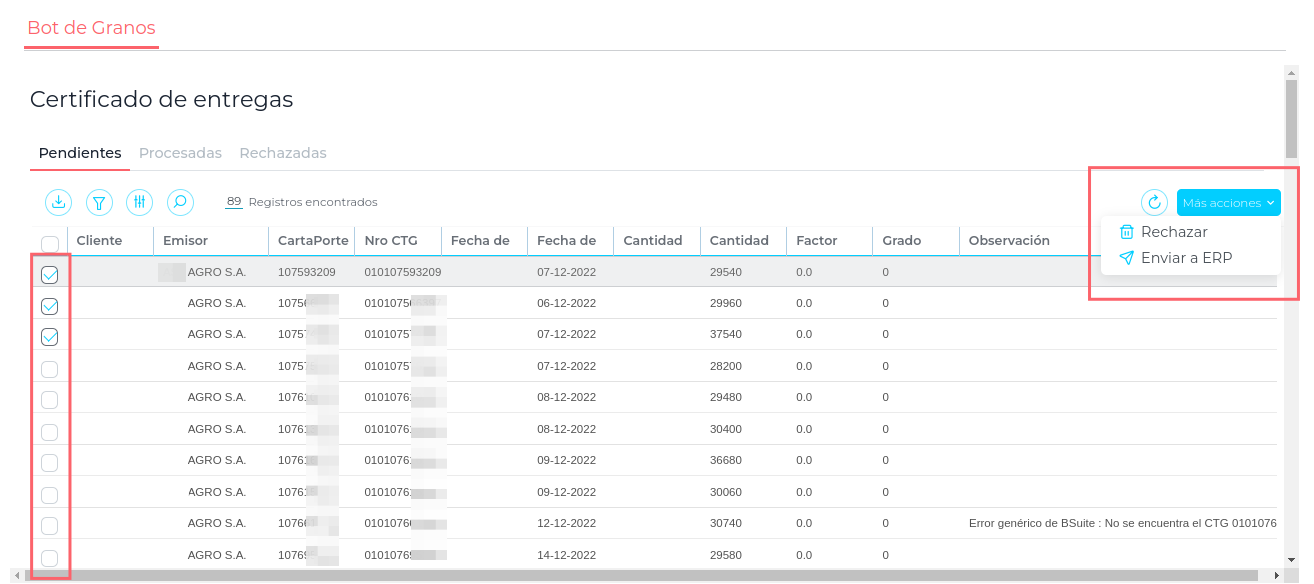 Posterior a estas configuraciones el sistema trae los certificados de depósito de la plataforma Williams, dejándolos disponibles en la app Bot de Granos; de esta forma pueden ser administrados por el usuario, rechazarlos o enviarlos al ERP: