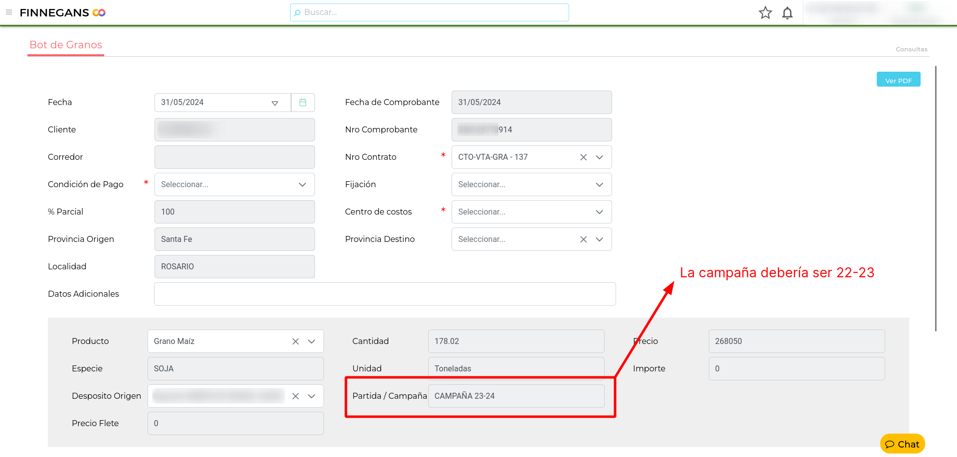 Al cargar una liquidación de venta de granos utilizando el Bot de granos, se detecta que la Campaña que trae automáticamente no es la correcta