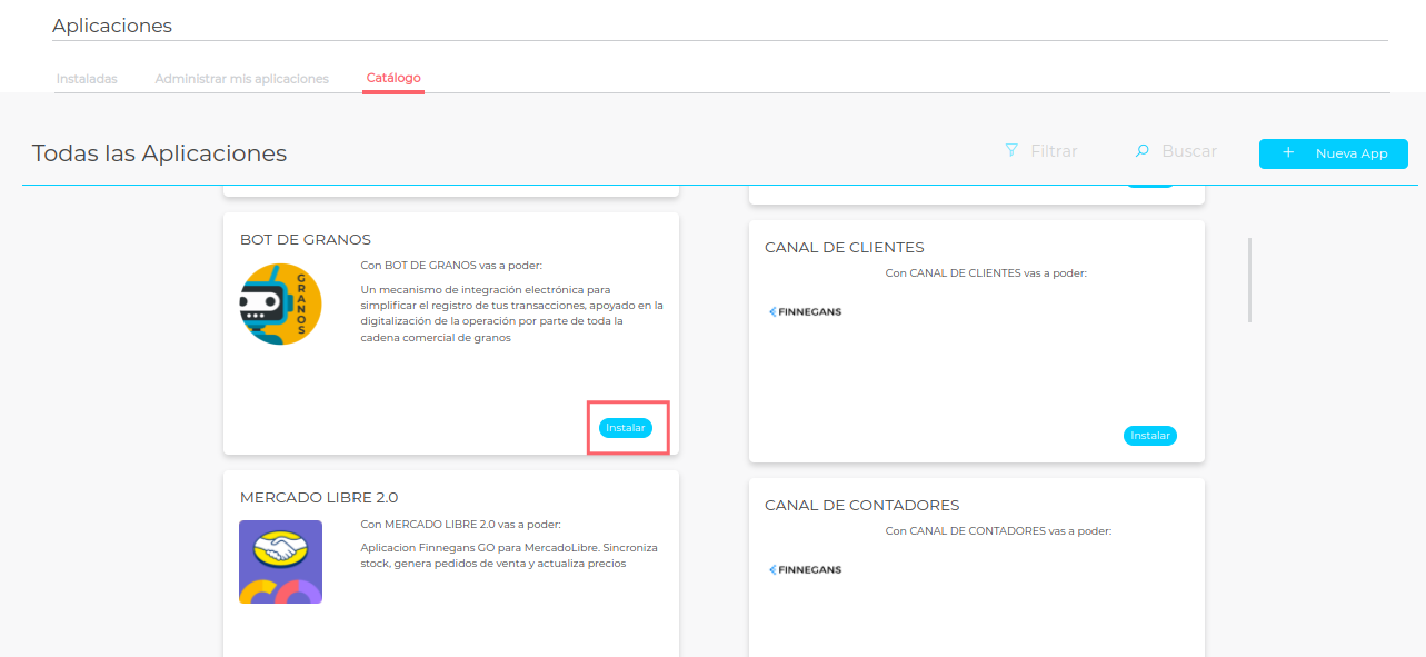La app de Bot de Granos está conectada a la app de DEALS, por lo cual es necesario contar con estas dos aplicaciones en Finnegans GO.