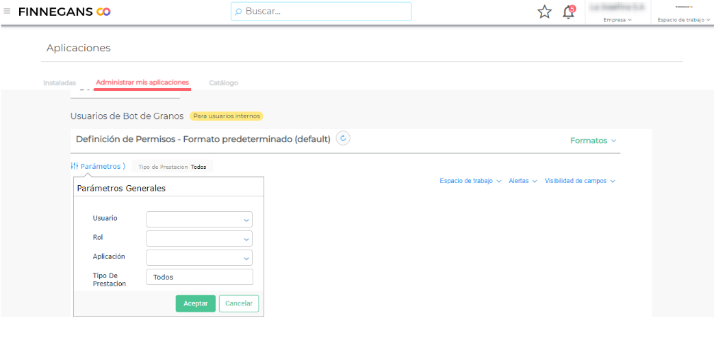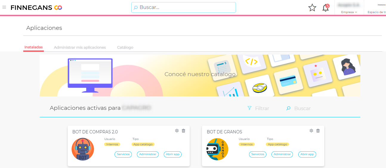 - Para poder asignar los permisos a los usuarios, ingresar a las aplicaciones nuevamente y presionar sobre la solapa “Instaladas”. Buscar Bot de Granos y presionar en el botón “Administrar”.