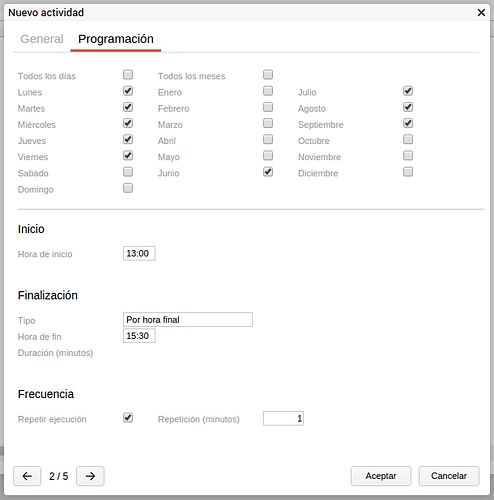 Como se observa en la imagen, este tipo de evento tiene dos pestañas en su configuración. El comportamiento del temporizador se configura en la pestaña Programación.