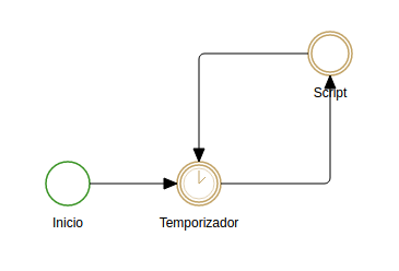 Los elementos básicos para este tipo de procesos son: un evento intermedio de tipo temporizador y un evento intermedio tipo default donde se incluye el script a ejecutar.