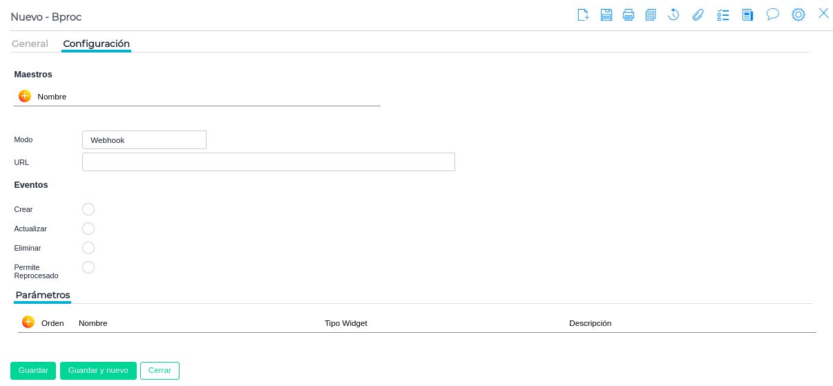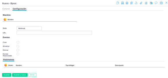 - Webhook: Este modo permite que el BProc se ejecute automáticamente después de que ocurra un evento específico, disparando una URL o microservicio.