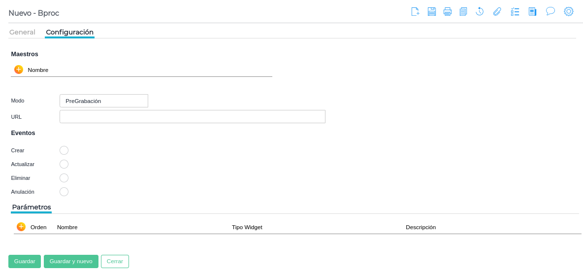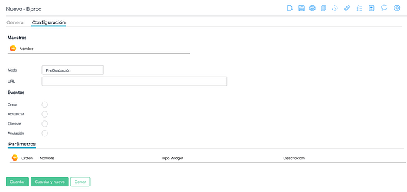 - Parámetros: Los Parámetros son para una configuración previa pero no son editables por el usuario, solo pueden configurarse a través de la ruedita de configuración en el maestro de bprocs.