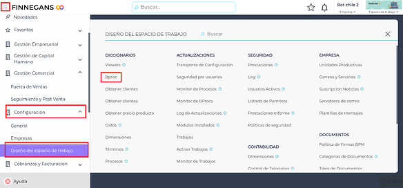 - Ir a Menú→ Configuración →Diseño de espacio de trabajo → DICCIONARIOS → Bproc
