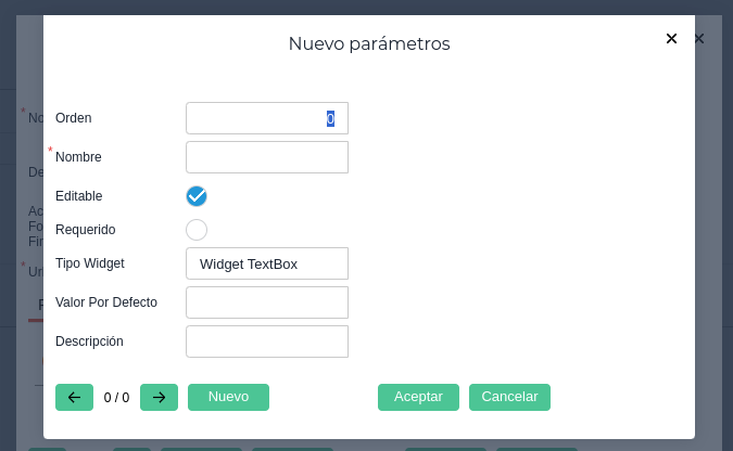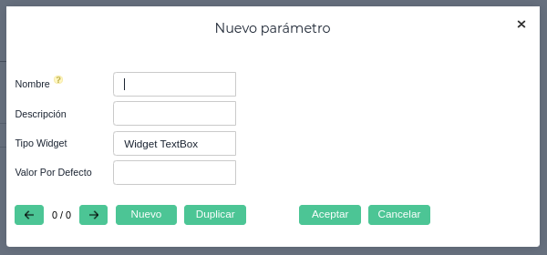 - Tipo Widget: tipo de dato del parámetro (Textbox, Integer, Long, Float, CheckBox, fecha, Selector).