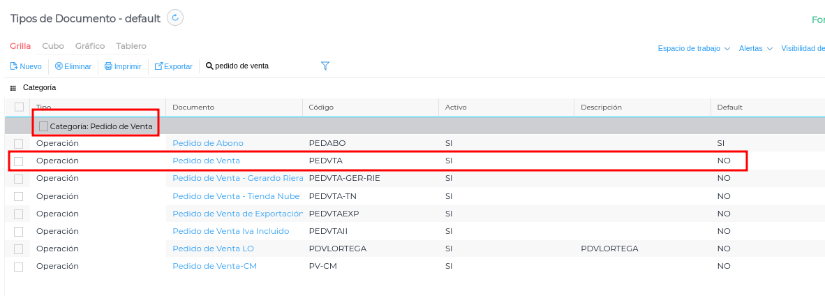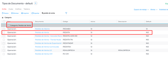 Buscar la categoría que elegiste al momento de crear el Bproc. Luego seleccionar en el documento que quieres configurar el Bproc que se encuentre dentro de esta categoría. En este ejemplo creamos el Bproc en la categoría “Pedido de Venta” y elegimos el documento “Pedido de Venta”.