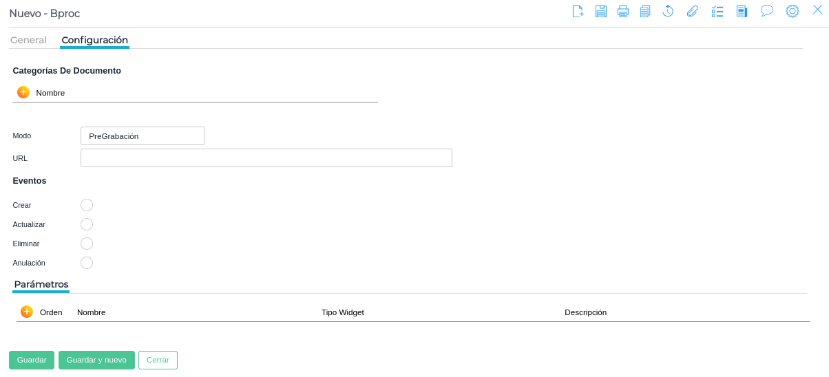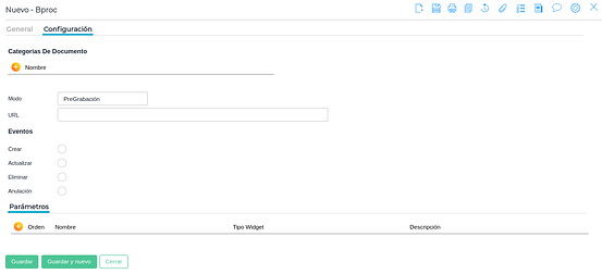 - Pregrabación: Similar al modo webhook, pero el BProc se ejecuta antes de que ocurra el evento. Esto permite realizar validaciones o modificaciones antes de que se confirme el evento.