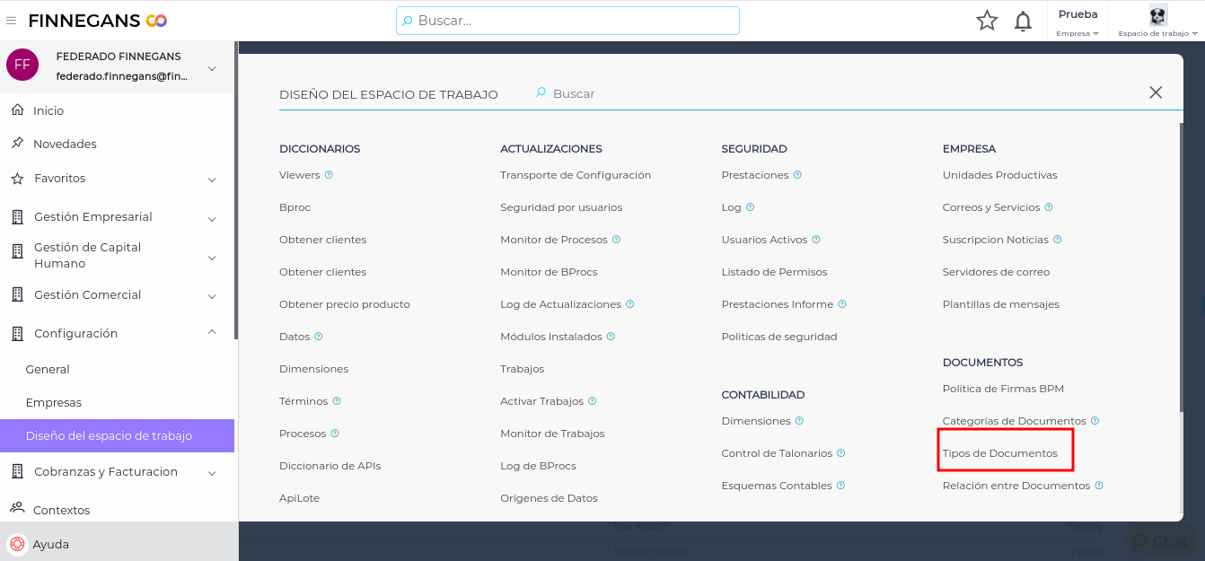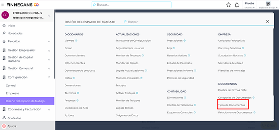 - Ir a Menú→ Configuración →Diseño de espacio de trabajo → DOCUMENTOS → Tipo de Documento