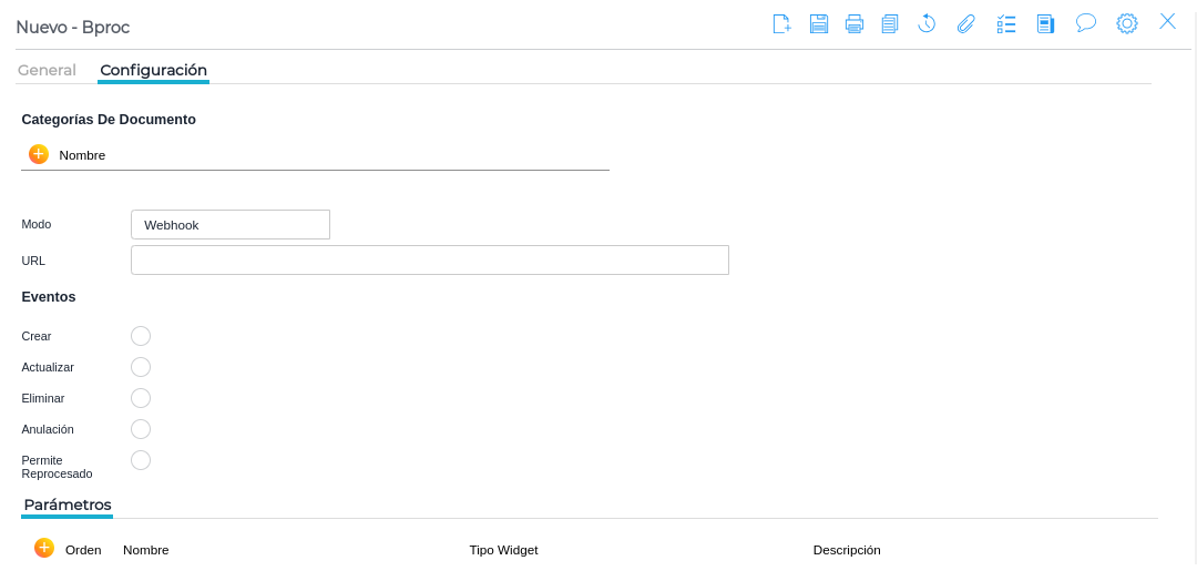 - Webhook: Este modo permite que el BProc se ejecute automáticamente después de que ocurra un evento específico, disparando una URL o microservicio.