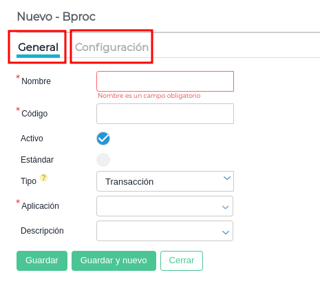 - Tipo: en este campo elegimos el tipo de bproc que estamos creando, en este caso seleccionamos el de “Transacción”.
