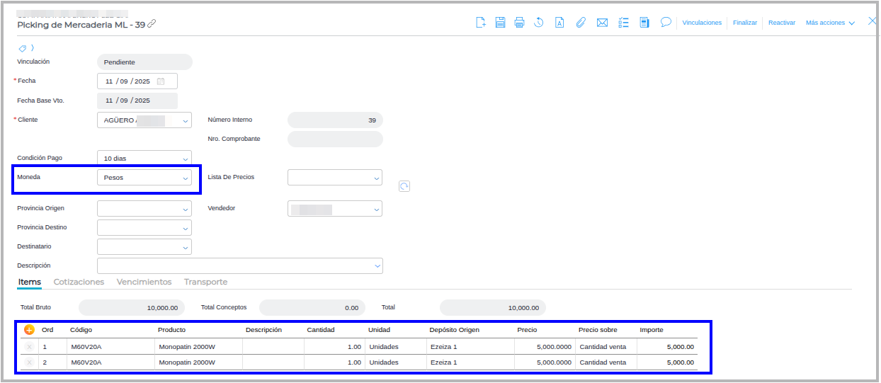 Crear despacho a partir de un Pedido de venta en dólares y otro pedido de venta en pesos
