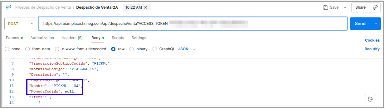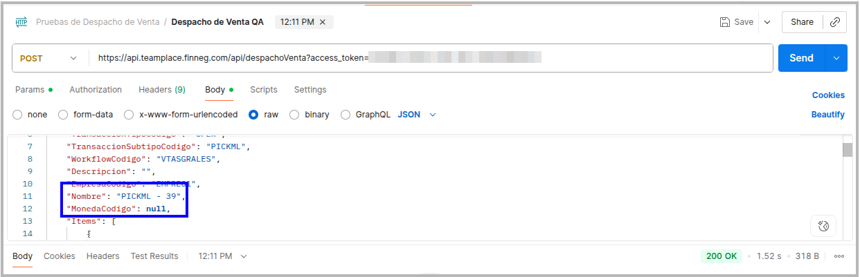 2- Enviar con un método Post un despacho mediante la API despachoVenta