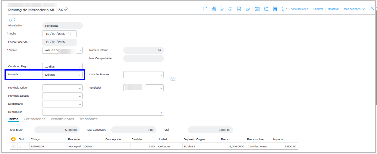 Crear despacho a partir de un Pedido de venta en dólares