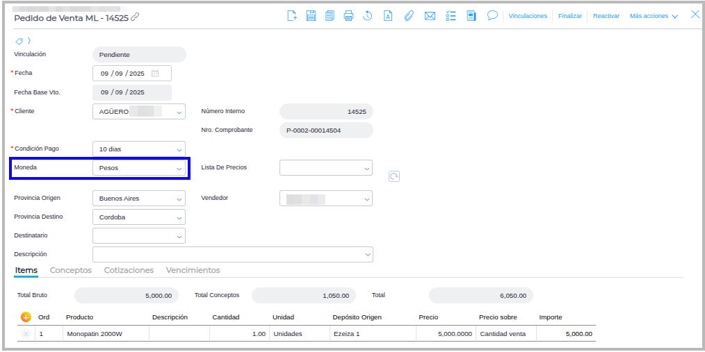2-Ir a Menú → Gestión Empresarial → Ventas → Pedidos, Crear un pedido de venta en moneda Pesos.