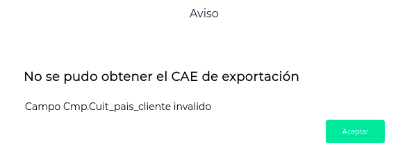 Al intentar obtener CAE de una factura de exportación sale este mensaje: