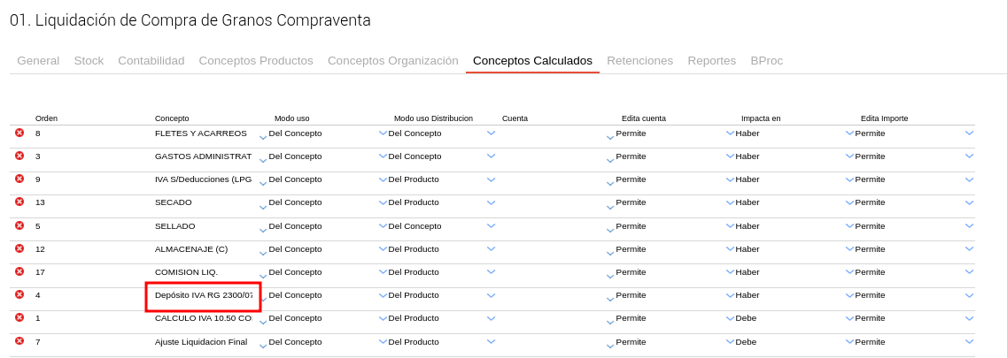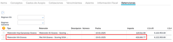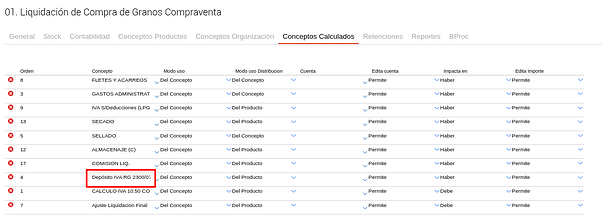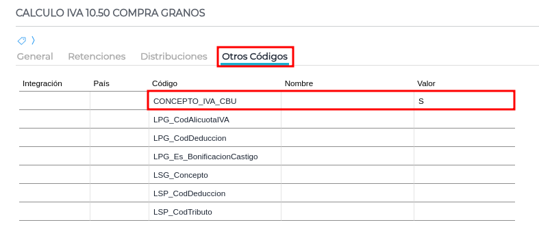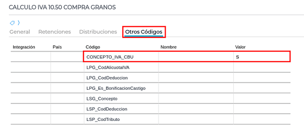 También hay que agregar el código adicional “S” al concepto calculado de IVA 10.5% compra de granos para que el sistema haga el cálculo de la diferencia entre este mismo y el total de la retención de IVA por score del tercero.