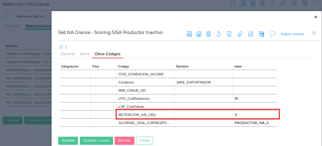 En cada una de las retenciones de IVA SISA, en el código adicional RETENCION_IVA_CBU asignar la letra S