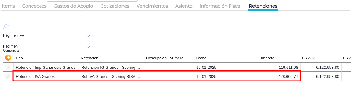 Previamente deben estar configuradas las retenciones de IVA SISA en el maestro de retenciones (aplicando por vigencia) (+info)