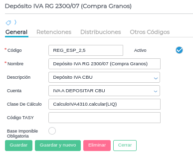 Nota: si la línea RETENCION_IVA_CBU no aparece en los códigos adicionales de las retenciones o conceptos calculados, podés consultar el siguiente instructivo donde se explican los pasos a seguir de cómo agregarlo.