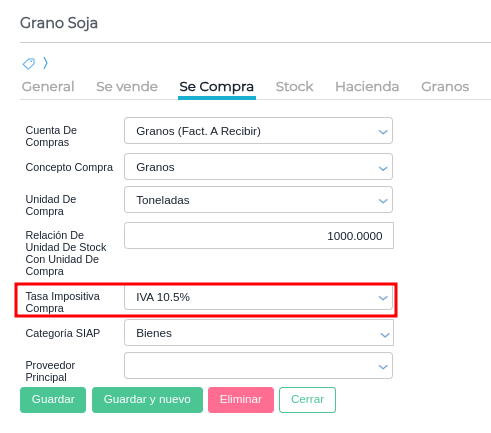 - Los productos a liquidar deben tener definida la tasa impositiva de IVA para compras: