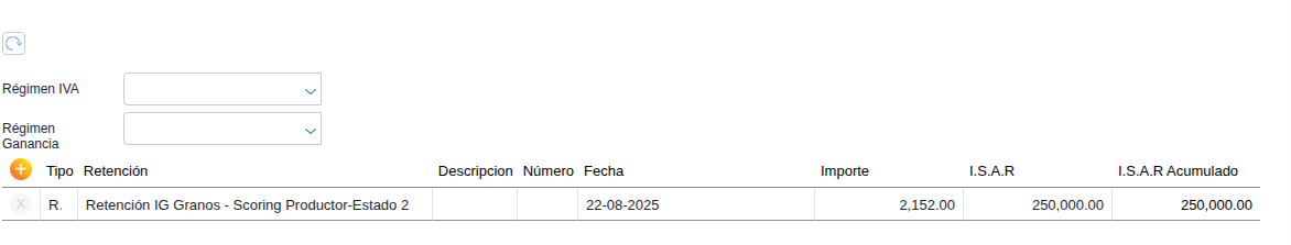 En la anterior captura de pantalla se puede ver un ejemplo práctico en el que se da una retención de ganancias imp. granos donde es el primer movimiento del mes por ende el isar acumulado es igual al isar y aunque la retención para el scoring productor-estado 2 debería ser del 2%, no se calculó por $250000 sino por $250000 - $142400.01(Minimo imponible) * 0.02.