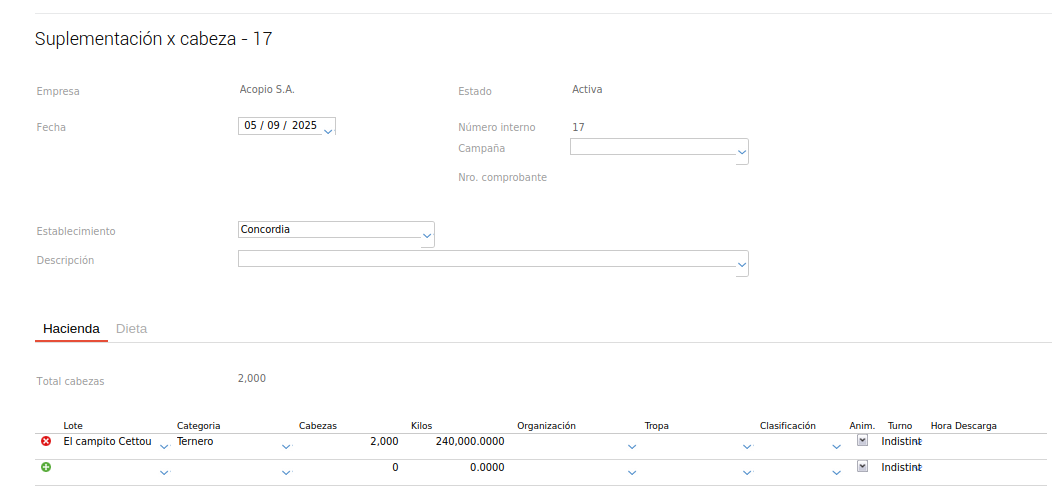 Finalmente, para determinar los requerimientos totales de alimento para el lote, esta cantidad por cabeza se multiplica por el número de animales, un dato que se encuentra en la pestaña “Hacienda” dentro del mismo módulo de suplementación.