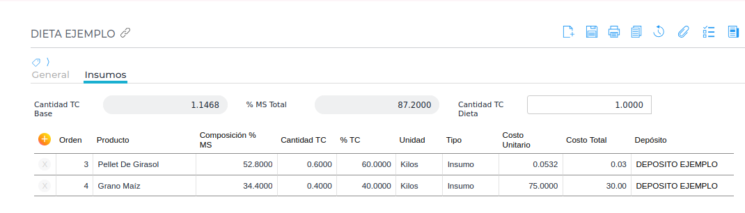Si el valor ingresado en este campo es 1 y las unidades de los componentes de la dieta están configuradas en “Kilos” (unidad de stock), esto implica que la ración total formulada para un animal es de 1 kilogramo. Este valor sirve como base para una serie de cálculos automáticos. El porcentaje de materia “tal cual” (% TC) de cada ingrediente se calcula de forma automática, ajustándose de manera proporcional a la cantidad que se haya ingresado manualmente en el campo “Cantidad TC dieta”. Este proceso garantiza la precisión en la composición de la ración final.