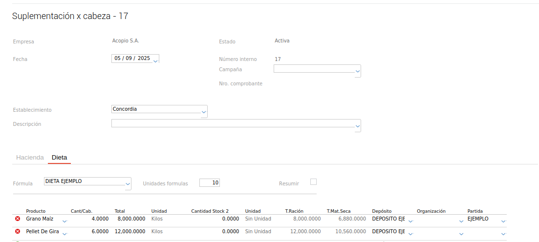 La verdadera potencia del sistema se evidencia al integrar la dieta formulada con el maestro de “Suplementación”. Al cargar una fórmula de dieta previamente creada, el sistema de manera automática asigna la “Cantidad TC dieta” a cada componente. Esta cantidad, que representa la ración base por animal, se multiplica por el campo “Unidades Fórmulas”. Este cálculo arroja el total de kilogramos de alimento (o de cada ítem) por cabeza, asegurando una dosificación precisa.