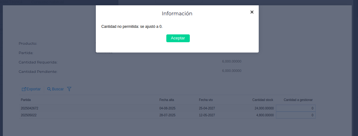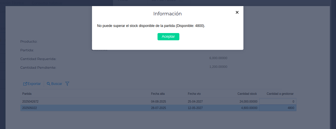 El sistema controla automáticamente las cantidades pendientes, ajusta los consumos para no superar el stock disponible y genera múltiples líneas de consumo por partida, garantizando la trazabilidad.