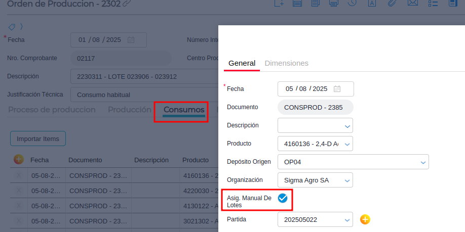 Orden de Producción: Habilitar la opción de Asignación manual de lotes en la solapa Consumos para los insumos a consumir.
