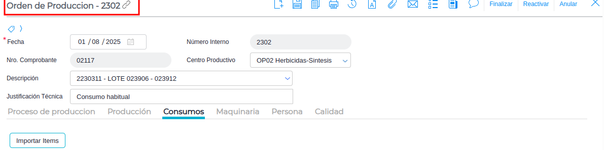 - Definir las cantidades a consumir en el ítem de la orden (en caso de no estar asociada a una fórmula).