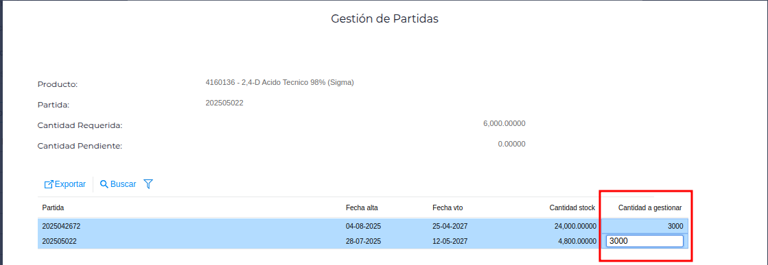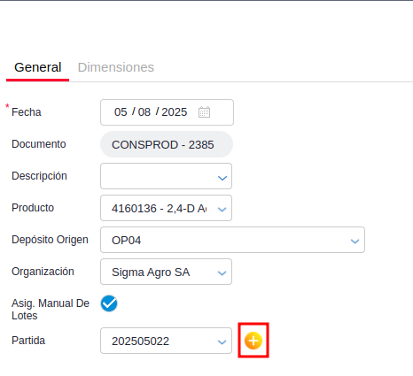 - Asignación manual de lotes: al activar el check, el usuario puede seleccionar manualmente partidas de stock, ya sea a través de un selector simple o mediante un botón +, que abre una grilla editable para distribuir las cantidades requeridas.