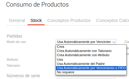 - Asignación automática (FIFO): cuando el check de Asignación manual de lotes está desactivado, el sistema asigna automáticamente los consumos siguiendo el criterio de partidas por fecha de vencimiento.