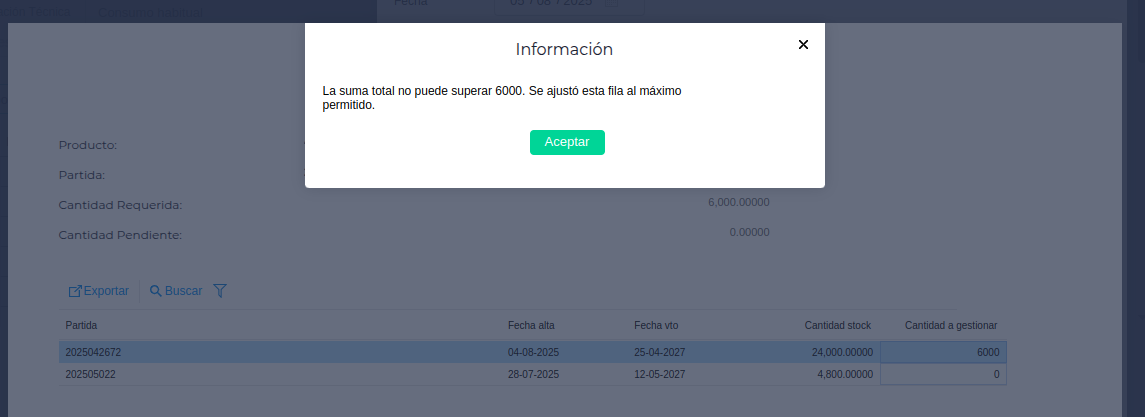 - Si la suma de cantidades ingresadas excede el total pendiente del ítem, el sistema ajusta la fila al máximo permitido y muestra el mensaje: