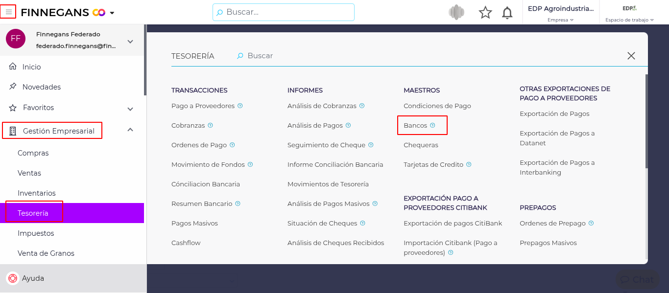 - Ingresar Desde Menú → Gestión Empresarial → Tesorería → Bancos.