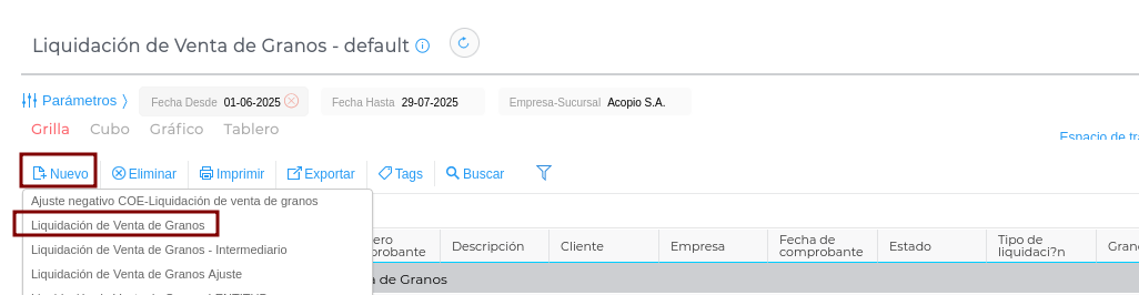 Comenzamos desde el Menú>Gestión Empresarial> Venta de Granos> Liquidaciones> Liquidación> Nuevo: