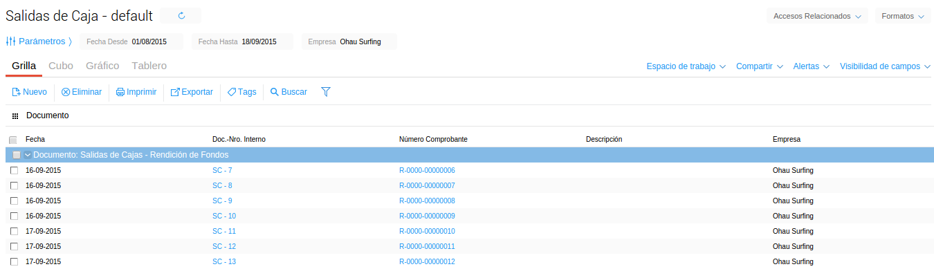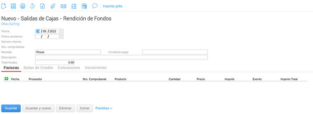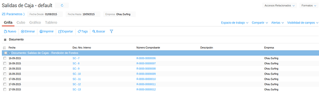 Al ingresar, el sistema muestra la grilla con las Salidas de Caja previamente guardadas y desde donde se puede acceder a ellas o cargar una nueva.